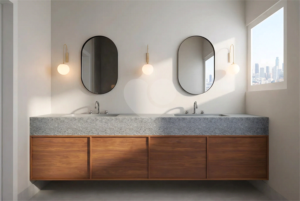 Acabamentos de alto padrão, incluindo revestimentos nobres, espelhos e box nos banheiros. Cozinha equipada com cooktop e forno embutidos.