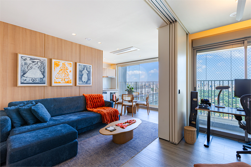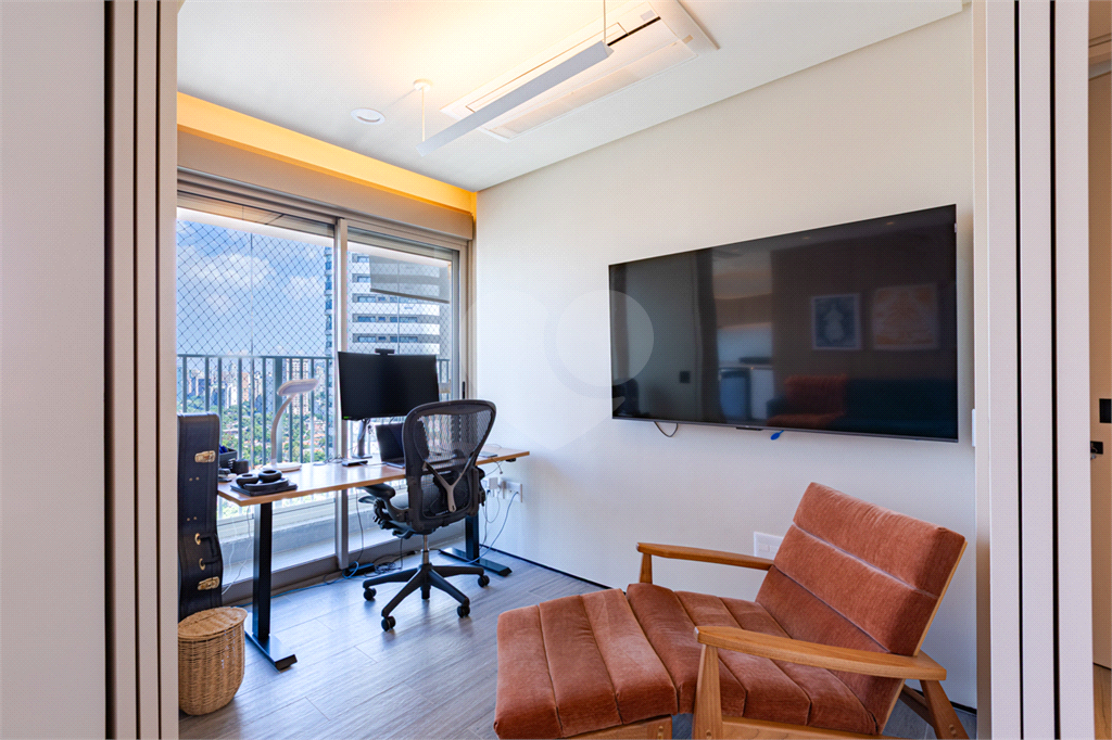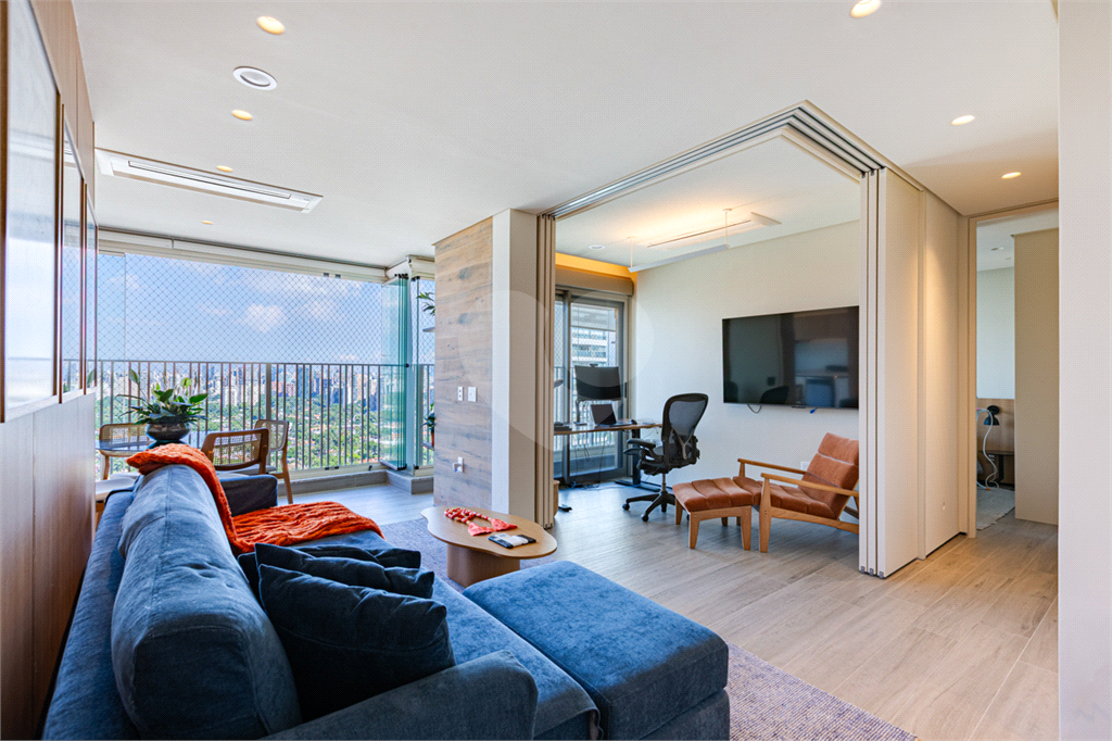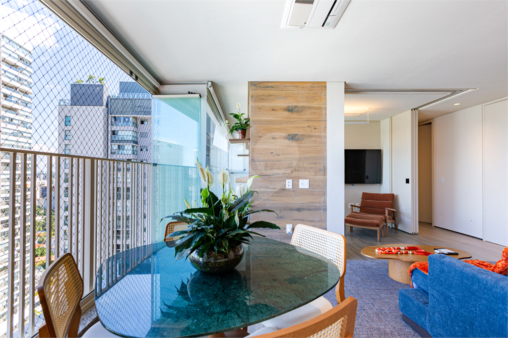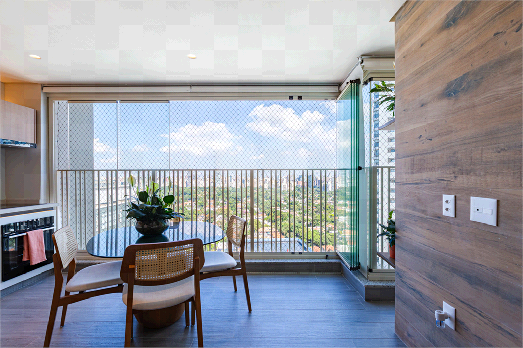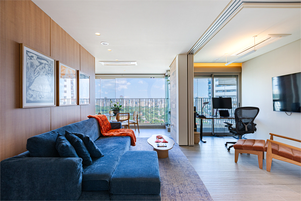 Sala integrada à varanda por amplas esquadrias de vidro, com luminosidade natural durante todo o dia. Varanda com revestimento em madeira e vista panorâmica totalmente livre para área verde e skyline paulistano. Acabamento de alto padrão, totalmente mobiliado, ar-condicionado Cassete (K7) e decorado.