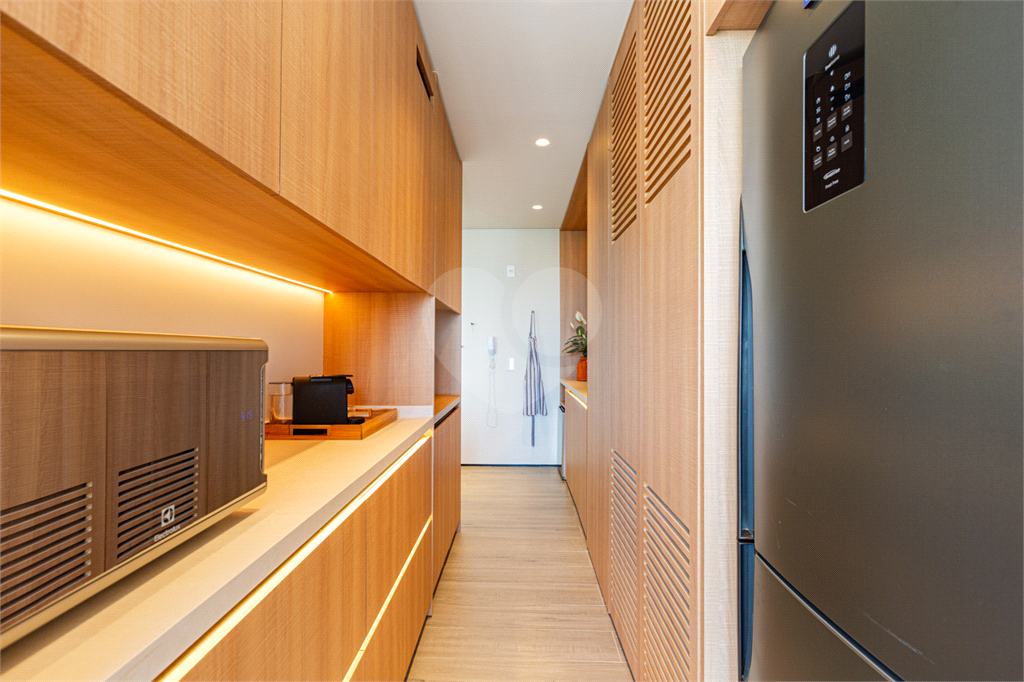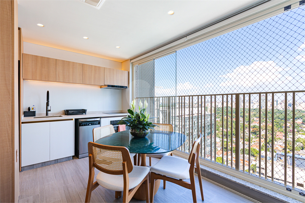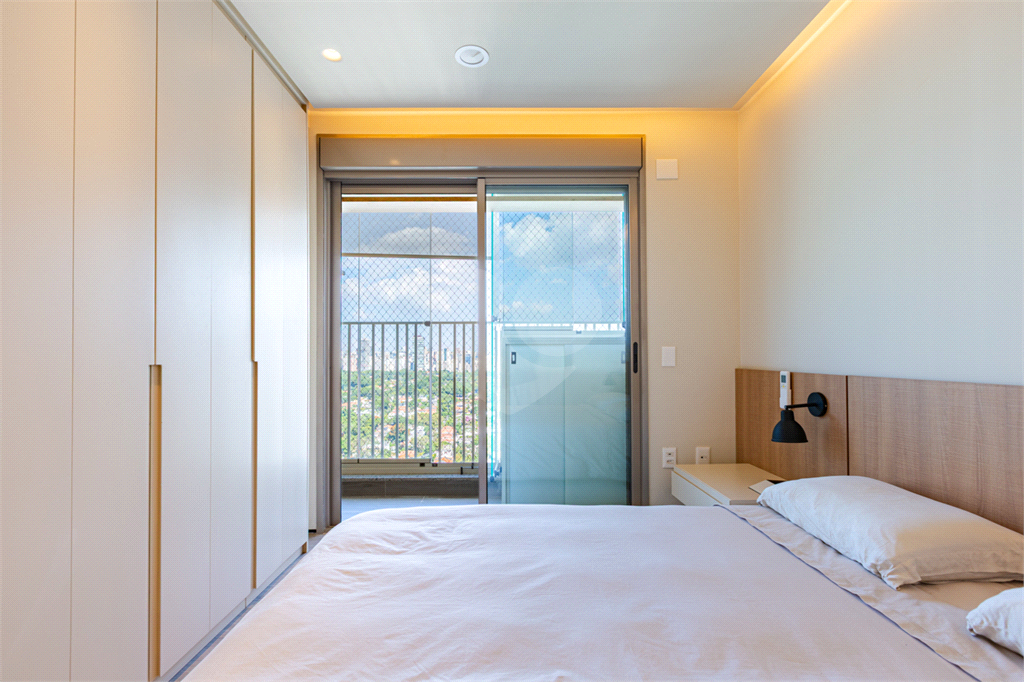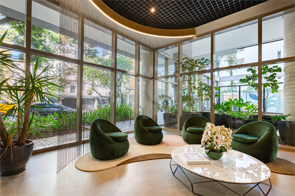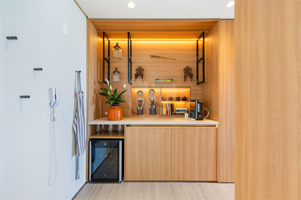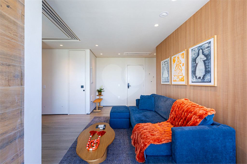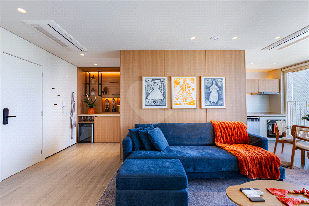 Sala integrada à varanda por amplas esquadrias de vidro, com luminosidade natural durante todo o dia. Varanda com revestimento em madeira e vista panorâmica totalmente livre para área verde e skyline paulistano. Acabamento de alto padrão, totalmente mobiliado, ar-condicionado Cassete (K7) e decorado.