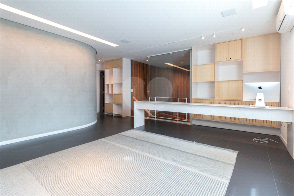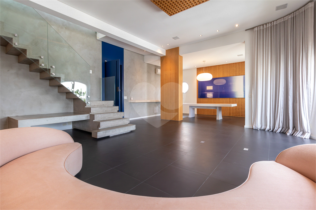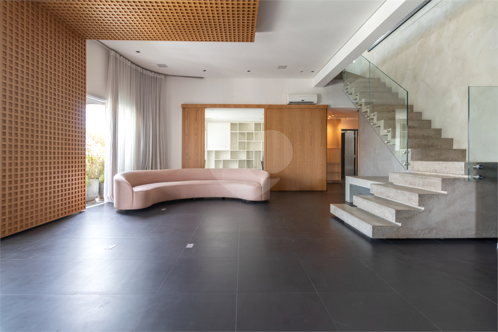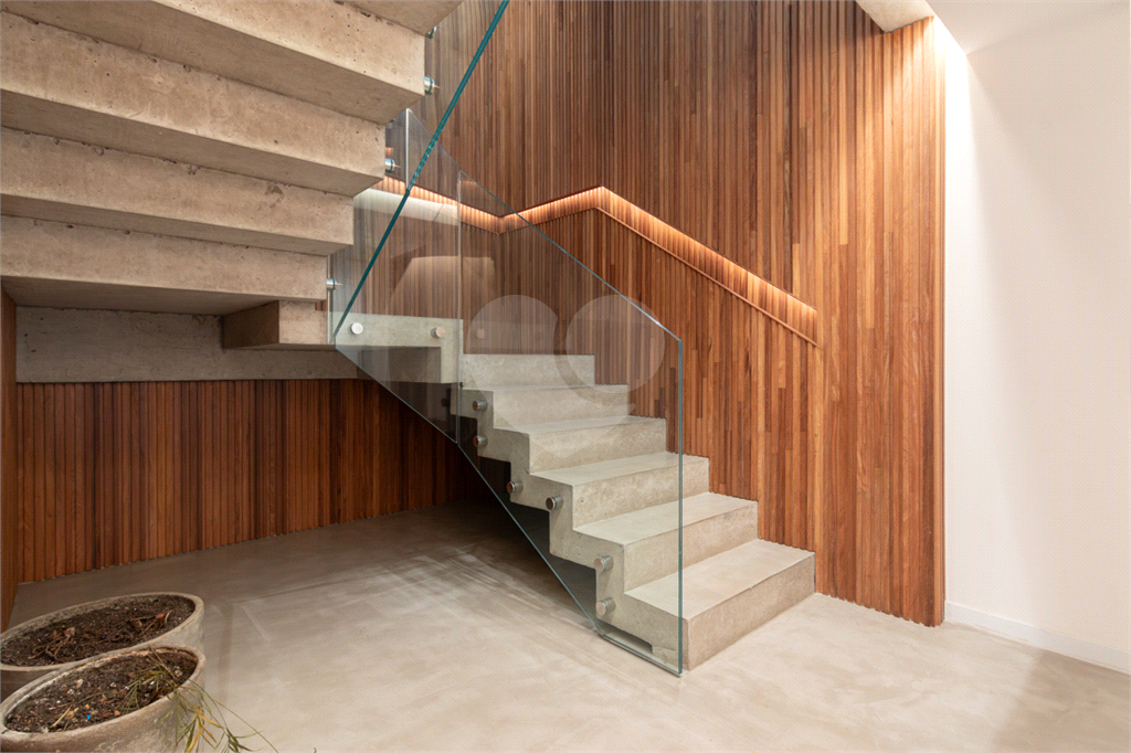 No piso intermediário, living, adega, escritório, lavabo, ampla sala de jantar e uma suíte perfeita para hóspedes. Nesse piso além da cozinha extremamente agradável e funcional, temos uma outra sala de TV que te convida e abraça.