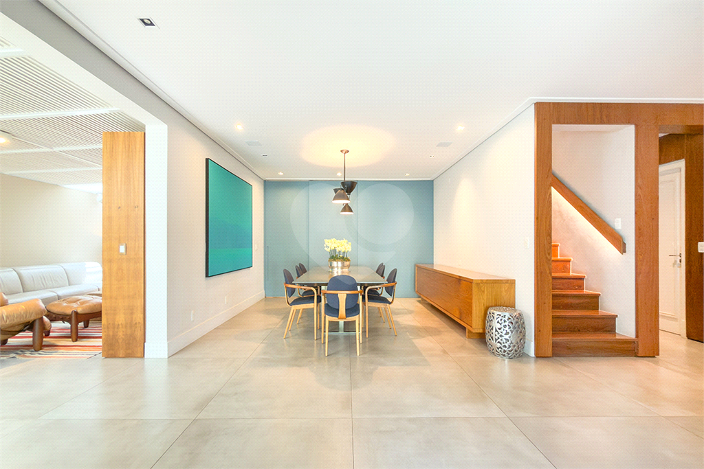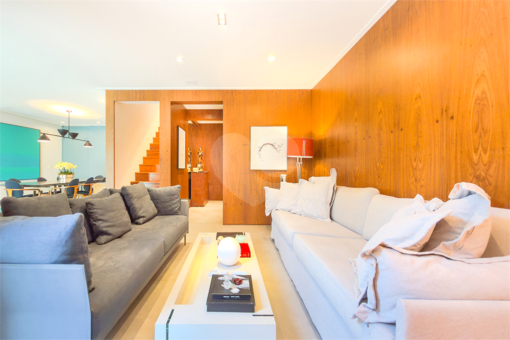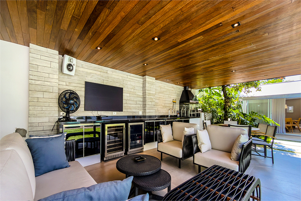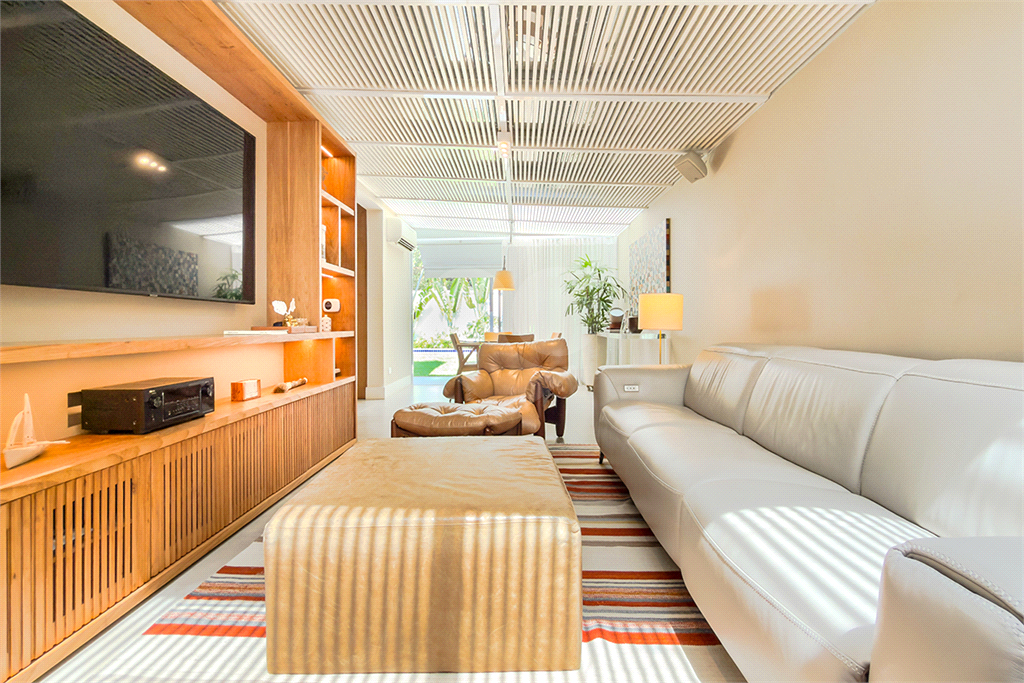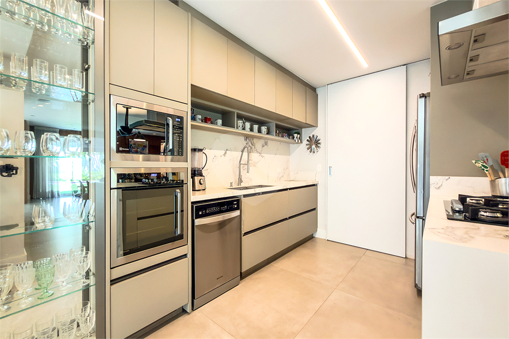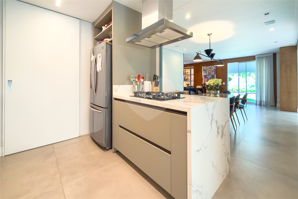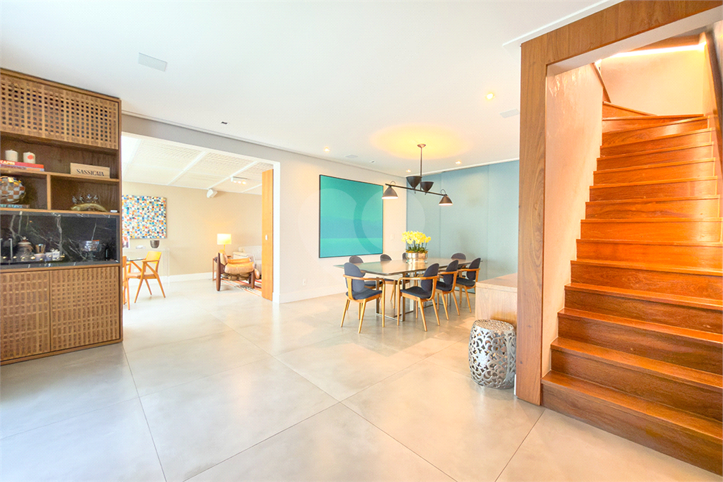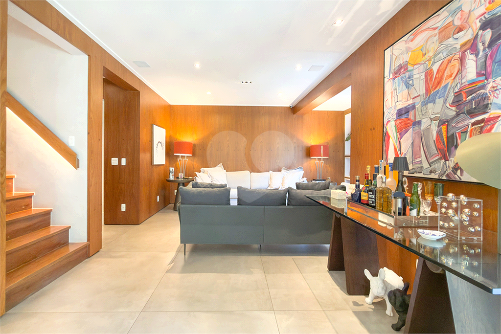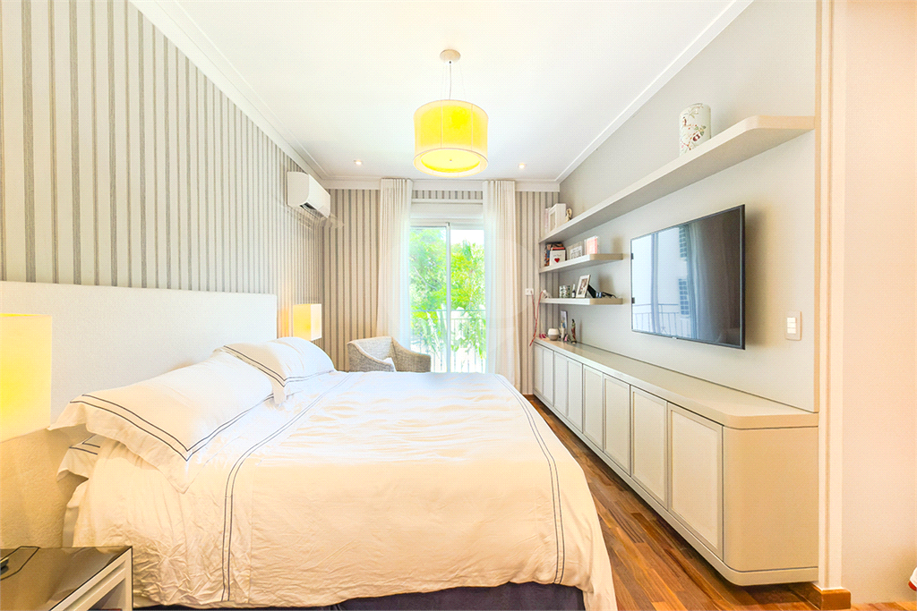 A marcenaria impecável, presente em todos os ambientes, incluindo a cozinha gourmet, reflete o cuidado em cada detalhe. O conforto térmico é garantido pelo ar condicionado em toda a casa, inclusive na cozinha. Um depósito generoso, dependências de funcionários e 4 vagas de garagem com acesso direto à residência, sua privacidade e conveniência são absolutas.