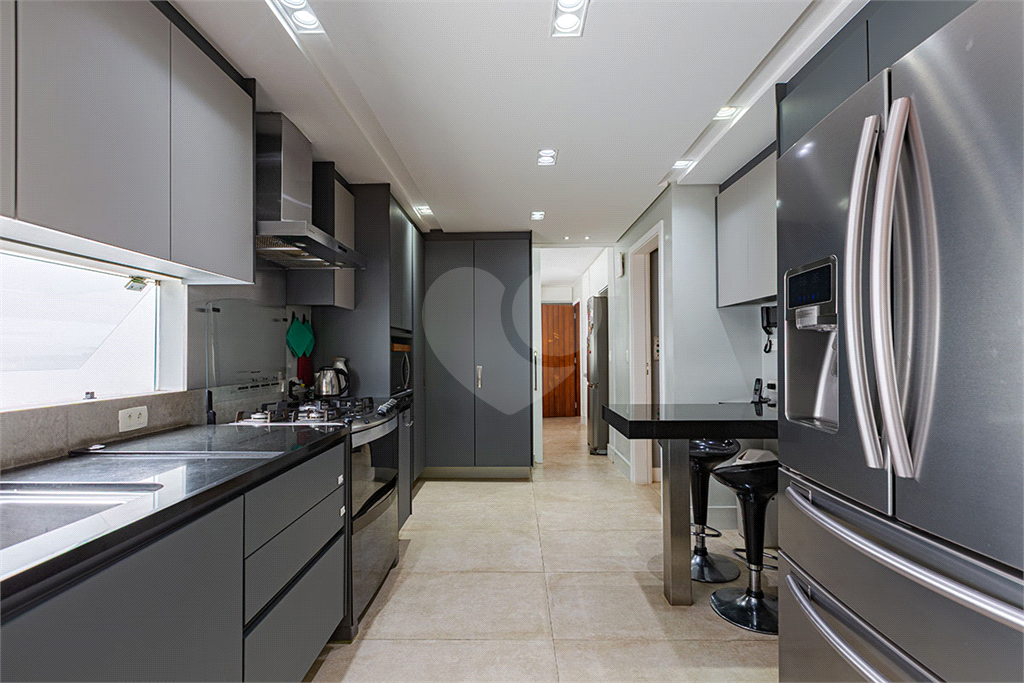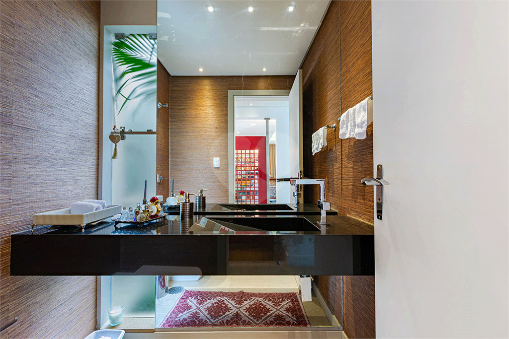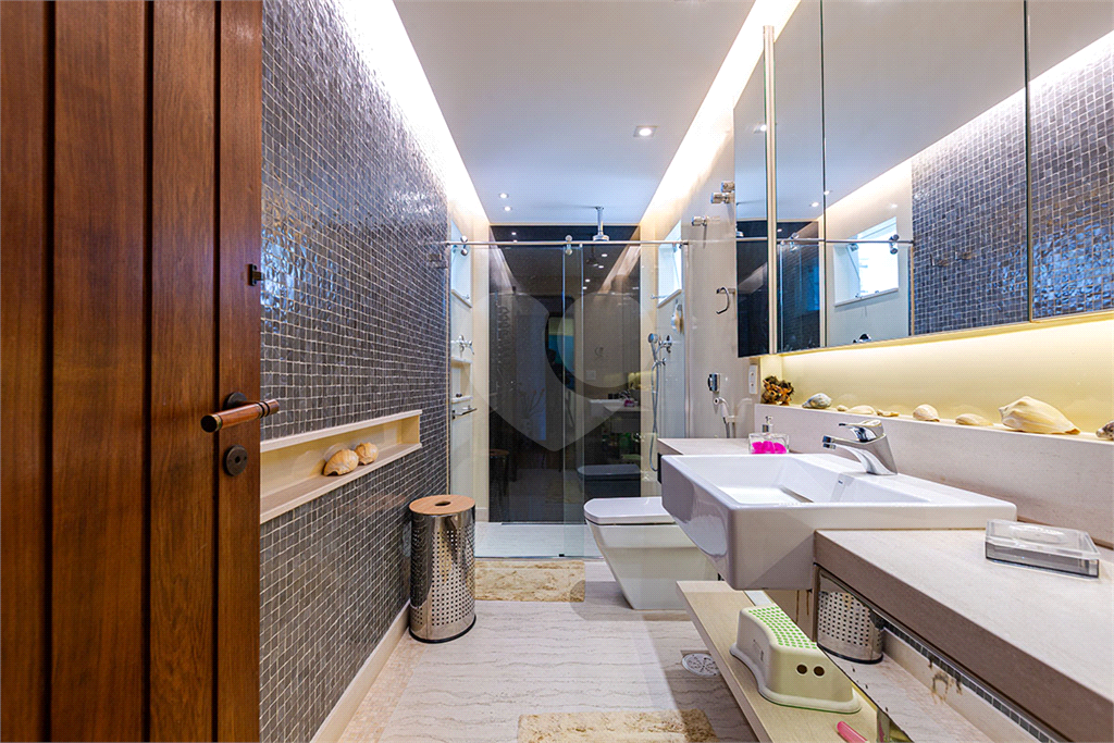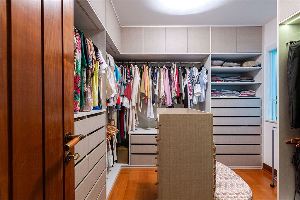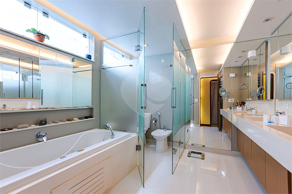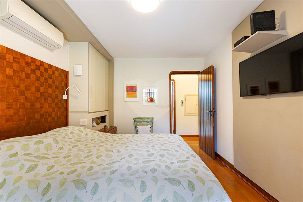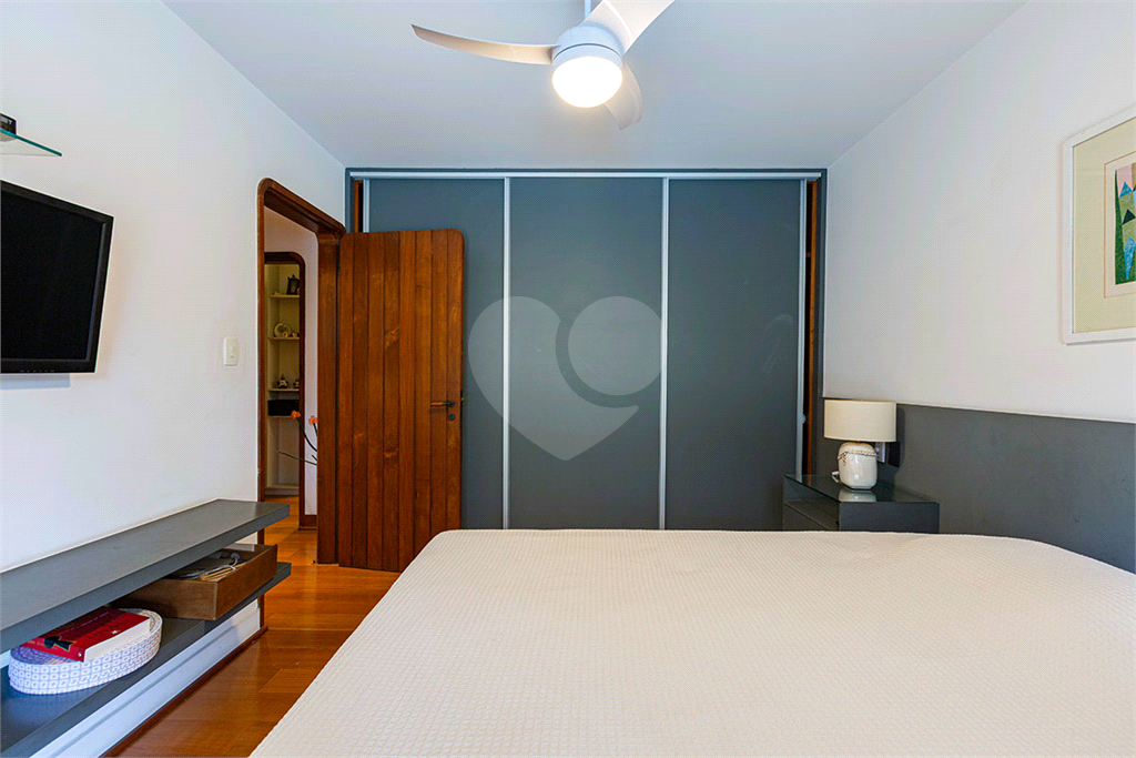 A área íntima dispõe de 2 suítes, sendo a suíte master com closet, banheiro com chuveiro e banheira separados, sapateira, rouparia, além de 1 suíte americana (dois dormitórios com ventilador de teto, banheiro compartilhado). Todos os quartos possuem armários de primeira linha, ar-condicionado nas suítes, sala de TV, adega, um pequeno e prático elevador de carga.