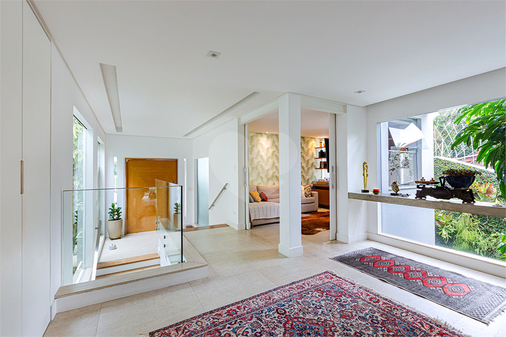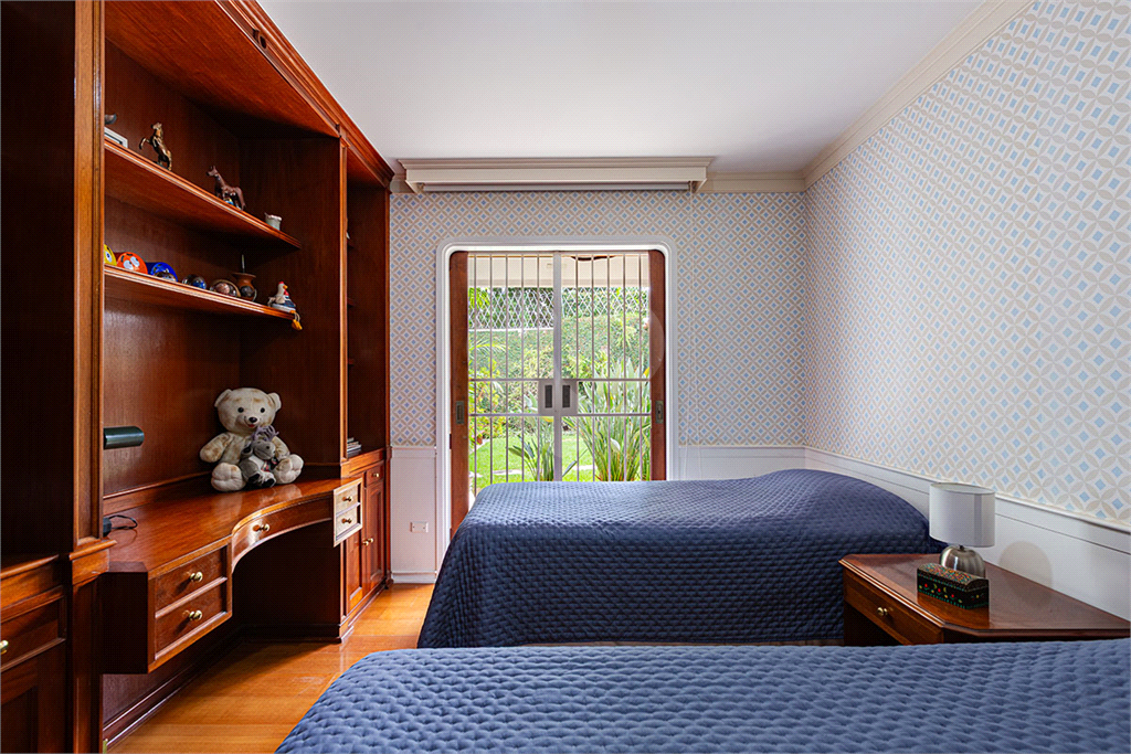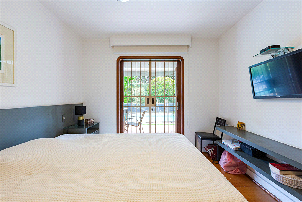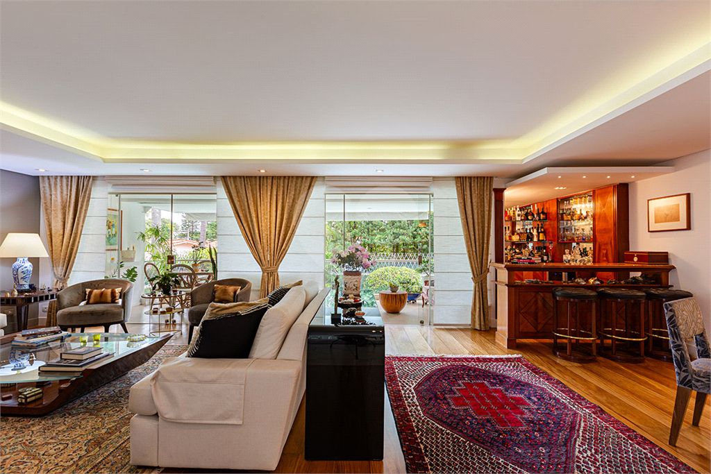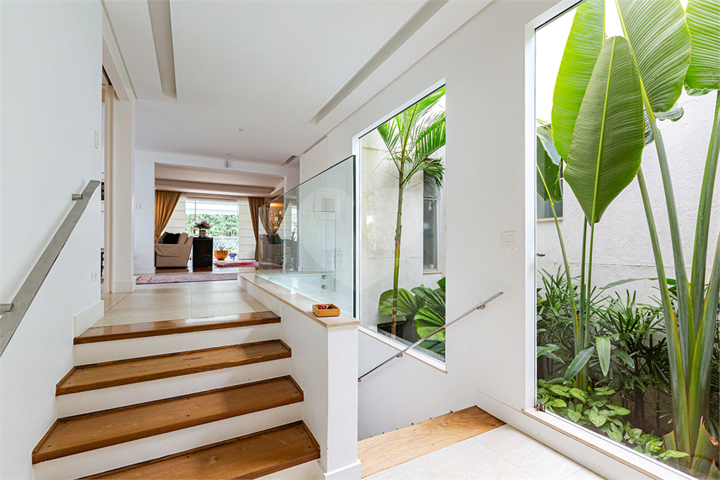No térreo, sala de TV, chapeleira, sala de estar com varanda, bar completo, sala de jantar com varanda, ambientes com ar condicionado, cozinha, copa, lavanderia e dependência para funcionários com dois quartos e um banheiro no corpo da casa. Gás de cilindro e sistema de energia solar fotovoltaica.